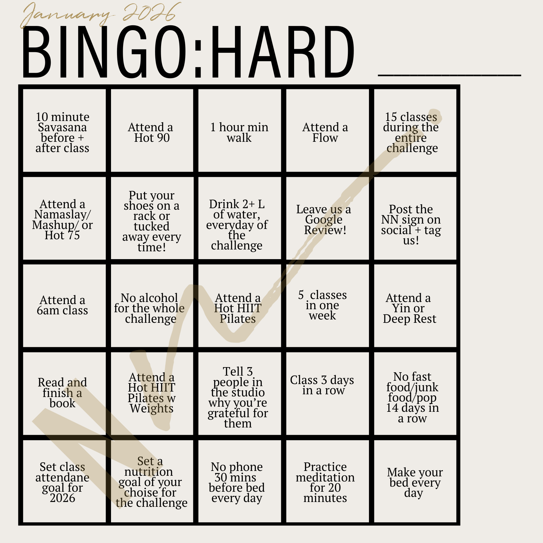 Every year, we host an amazing community challenge that kick starts your year with intention, movement, and a little playful motivation. Our January BINGO Challenge invites you to try new classes, explore feel-good wellness habits, and stay connected to your practice over 30 days - no pressure, just progress.
